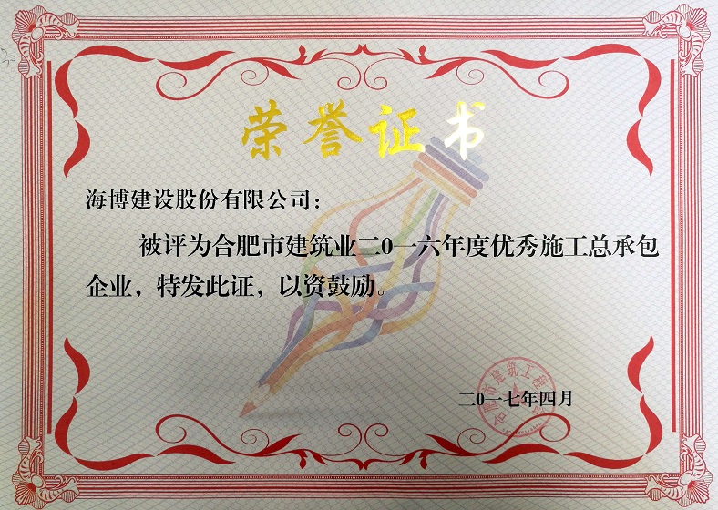在一年一度的合肥市建筑業(yè)優(yōu)秀企業(yè)評選中,我單位經(jīng)過市建委、市建筑工程協(xié)會的層層評比,最終獲得合肥市建筑業(yè)2016年度“優(yōu)秀施工總承包企業(yè)”及“優(yōu)秀監(jiān)理企業(yè)”雙項榮譽...
