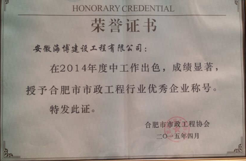 合肥市市政工程2014年度“雙優(yōu)”評選結(jié)果于近日揭曉,安徽海博建設(shè)工程有限公司榜上有名,榮獲“2014年度合肥市市政工程優(yōu)秀企業(yè)”稱號。 此次,公司被評選為“優(yōu)秀企業(yè)”,鼓舞了員工的...