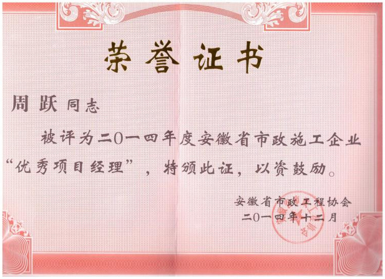 在安徽省市政工程協(xié)會評選的2014年度“安徽省市政施工企業(yè)優(yōu)秀項目經(jīng)理”活動中,共評出49位市政優(yōu)秀項目經(jīng)理,我公司周躍、榮飛兩位同志榮獲該項殊榮。...