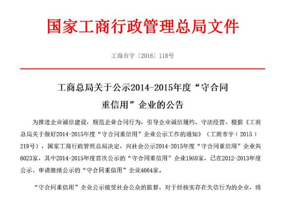 近日,國家工商行政管理總局向社會公布了2014-2015年國家級“守合同,重信用”企業名單,我公司以誠信經營的理念和實際行動再次獲得社會各界的認可,榮獲了此殊榮。