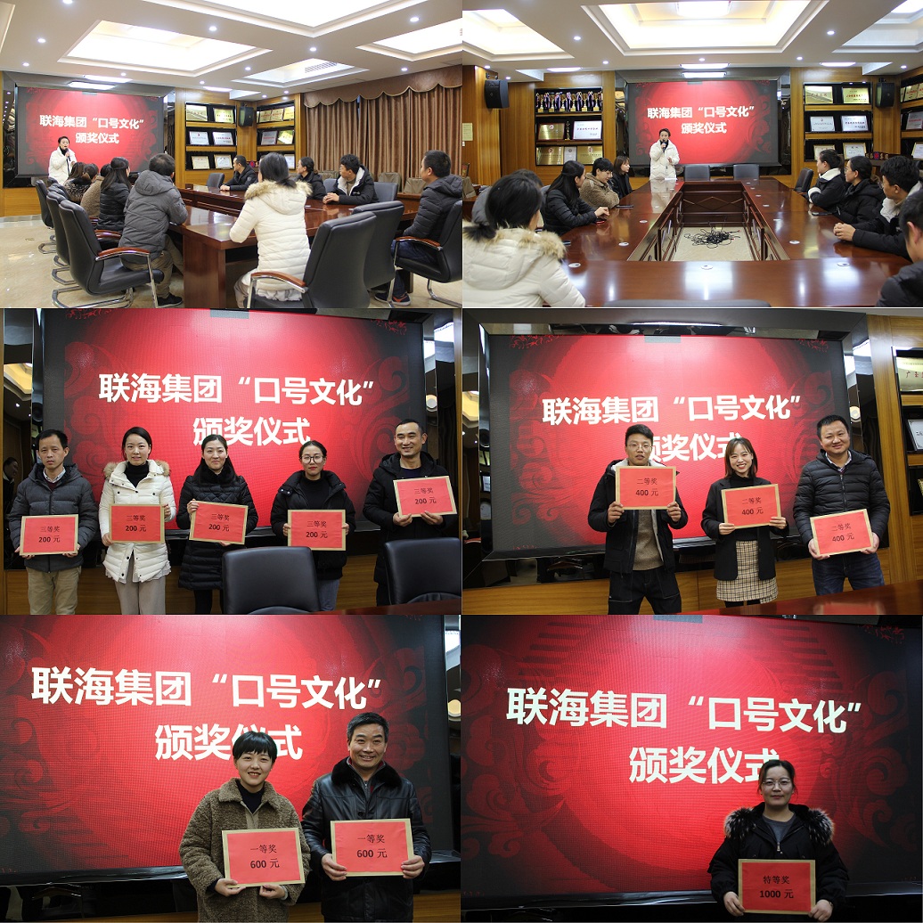 近期,集團公司開展了《關于聯海集團“口號文化”征集大賽的通知》活動,經過兩次征選、全員投票的方式,評比出特等獎、一等獎、二等獎、三等獎共計11條獲獎口號。并于2019年12月25日下午17:00由發展戰略執行中心組織了頒獎儀式,對獲獎口號的部門給予表彰和現金獎勵。