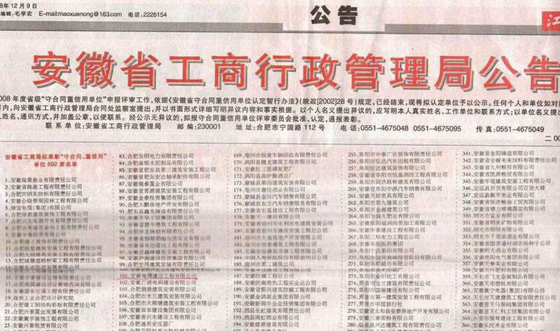 在2008年底由安徽省工商行政管理局舉辦的2007-2008年度“守合同、重信用”企業(yè)評選中,我公司在企業(yè)成立時間短、參選單位數(shù)量多等不利情況下,憑著管理層在企業(yè)成立至今一直貫徹執(zhí)行的合同管理制度、樹立社會良好信用品牌理念的指引下,從諸多大中型企業(yè)中脫穎而出,一舉當(dāng)選。